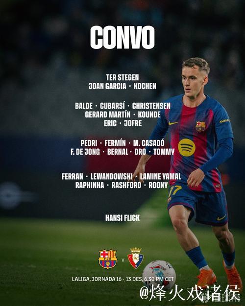 作者:2026-01-08T18:35:33+08:00北京时间本周末,巴塞罗那将在西甲联赛中客场挑战一向以强悍作风著称的奥萨苏纳,赛前加泰罗尼亚豪门公布了本场比赛的大名单:莱万多夫斯基、亚马尔领衔锋线,特尔施特根入选守护球门,但球队阵中三位以“C”打头、...